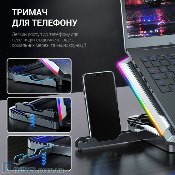Внизу компактно кріпиться знімна панель під розміщення смартфона, а крім того, тут же поруч обираємо та фіксуємо найоптимальніший вам кут нахилу підставки.
