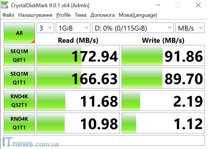 А ось запис підтверджуємо - до 100 МБ/с. Більше цифр далі на ілюстрації.
