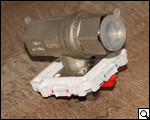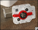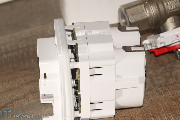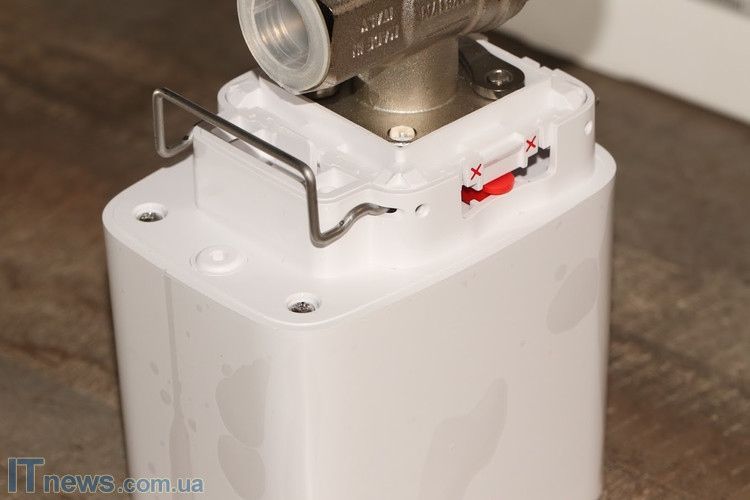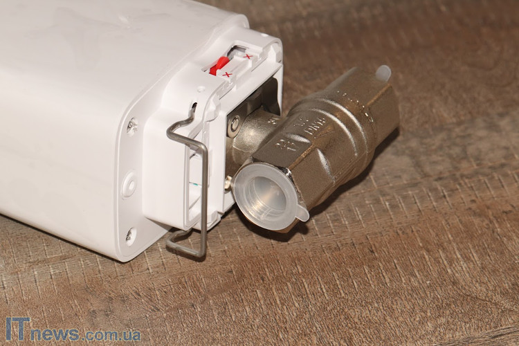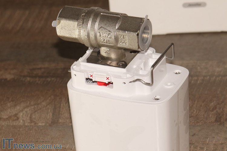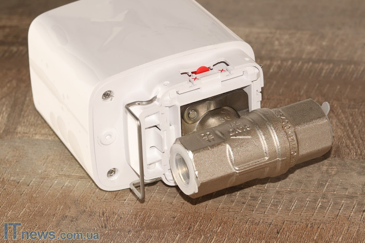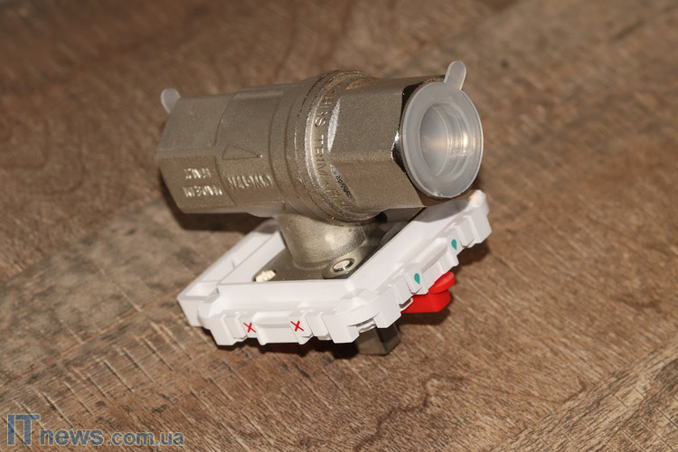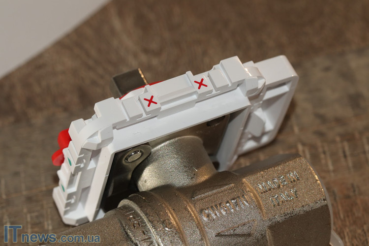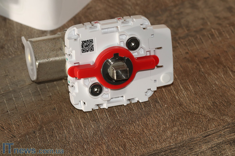 Так, з батарейками розібралась, давайте тепер повернемося на "поверх вище". То ж роз’єднавши кран з блоком приводу, користувач не зможе не помітити досить масивну червону деталь з пелюстками. Якщо останні знаходяться на червоних індикаторах – кран перекритий, зелених – виконана протилежна дія. Індикатори позначені так, щоб легко зрозуміти відкрита чи перекрита наразі вода. За відповідну кнопку на одній зі стінок вже все було сказано вище.