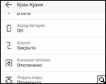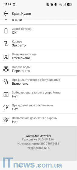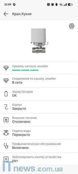 Меню Ajax WaterStop – це два великі розділи. Перший – сповіщення стосовно поточного стану заряду, наявність (чи ж відсутність) зовнішнього живлення, положення (відкрито/закрито) крану та ін. Другий розділ – налаштування. Тут можна перейменувати пристрій, обрати іншу кімнату для розміщення та багато ін. Далі на фото деталізація.