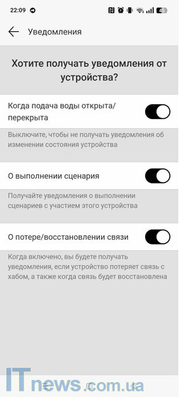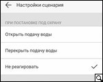 Сценарій "За тривогою" відповідає за автоматичне перекриття води у випадку відповідного спрацювання датчика LeaksProtect. Однак, якщо, наприклад, спрацював пожежний датчик, тут вже все залежить від відповідного налаштування для конкретної кімнати – може бути, як закриття крана, так і його відкриття, оскільки потреба у воді не виключена.