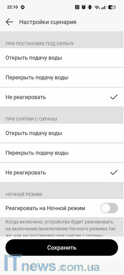 Перший зі згаданих сценаріїв дозволяє відкривати/перекривати подачу води під час встановлення об’єкта (офіс, квартира, будинок і т.д.) на охорону чи ж, відповідно, зняття з неї. В цьому ж сценарії передбачена можливість активувати пункт "Реагувати на Нічний режим". За роботи останнього кран буде реагувати точно так, як і за умов встановлення на охорону чи ж зняття з неї.