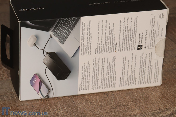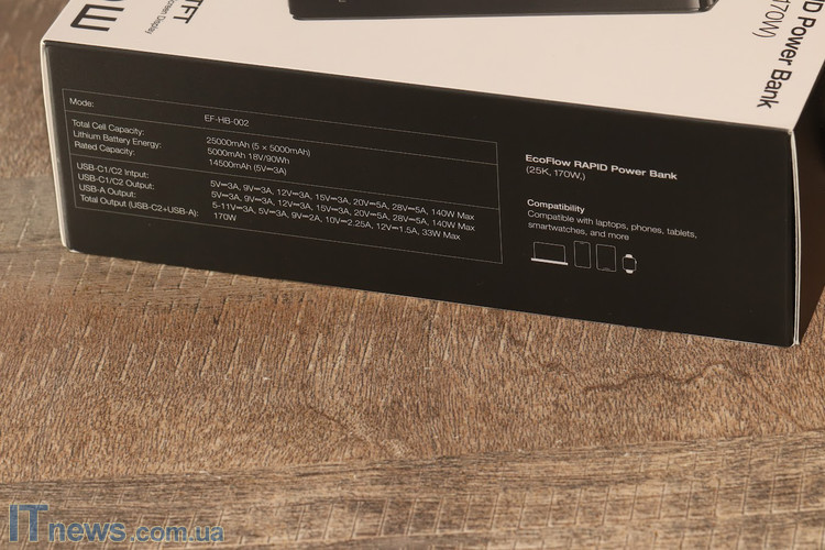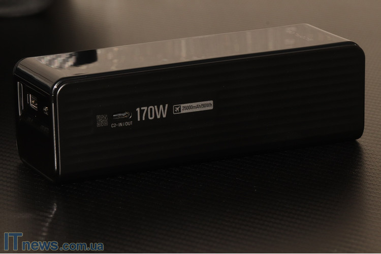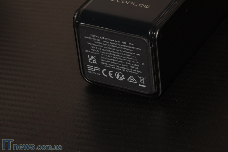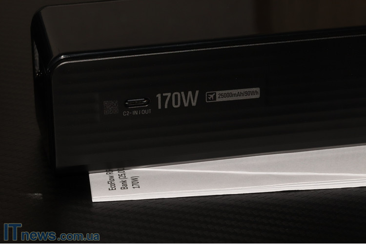 Протилежна частина корпусу примітна наявним тут портом type-C. Біля нього кілька ключових позначок: С2 (маркування порту для відповідної таблиці навантажувальних характеристик – про неї ще також згадаємо), in/out – можливість для порту працювати не лише на заряд самого повербанка, але й заряд від нього акумулятора стороннього споживача. Крім того, ще тут примітка максимальної потужності моделі та ще одна, яка вказує на придатність EF-RAPID25K140W-S-EU для авіаперевезень.