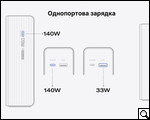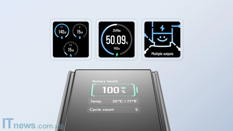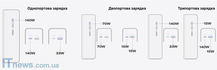 - Загальна кількість вихідних портів – 1 порт Type-C1: 140 Вт, 1 порт Type-C2: 140 Вт, 1 порт USB-A: 33 Вт;