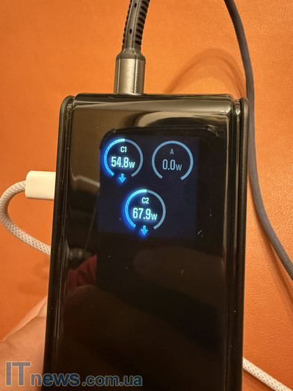 Сама підзарядка EF-RAPID25K140W-S-EU здійснюється на максимальній потужності 60Вт – мав змогу перевірити за допомогою 100Вт Gembird TA-UC-PDQC100LCD-01-BK; з кількох залишкових відсотків до повної "сотні" у нас займає близько 1,4 години часу.