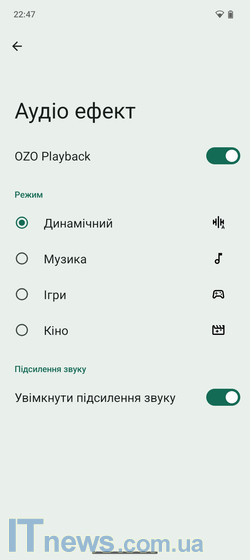 Щодо налаштувань, відповідний пункт меню, крім класичного "арсеналу" як-то гучність медіа та розмови, дзвінки, сповіщення і т.д., запропонує цікавий сервіс "Живі субтитри". Він розпізнає мовлення на пристрої, на основі якого автоматично створюються субтитри. Інший розділ – "Аудіо ефект" - дозволяє обирати один з режимів (динамічний, музика, ігри та кіно), а також "підключати" OZO PlayBack та "Підсилення гучності OZO".