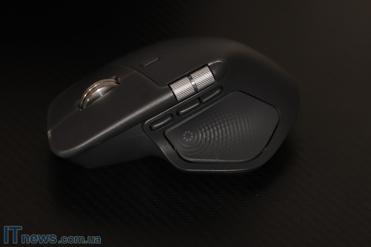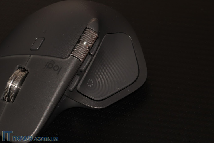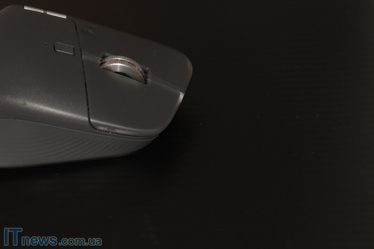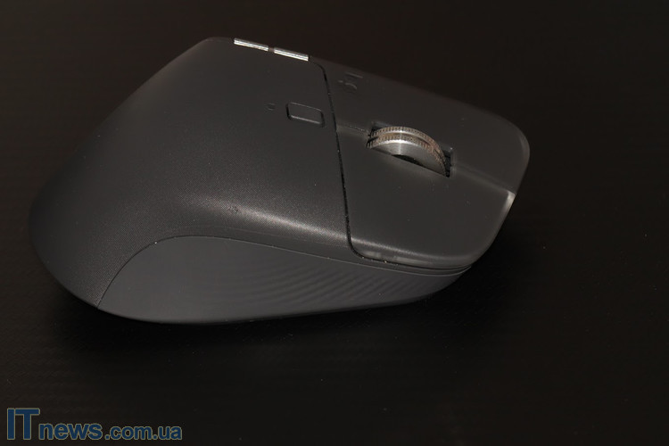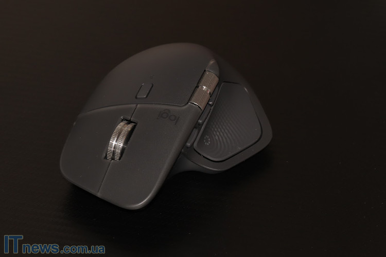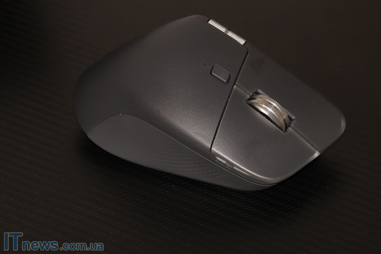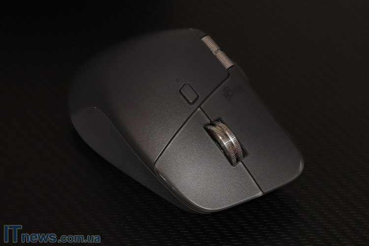 На панелі зверху у Logitech MX Master 4 класично кнопки правого/лівого натиснення – кожна з ну дуже тихими перемикачем. Між ними коліщатко MagSpeed з можливістю перемикання. Дещо далі маємо кнопку перемикання режимів та світлодіодний індикатор.