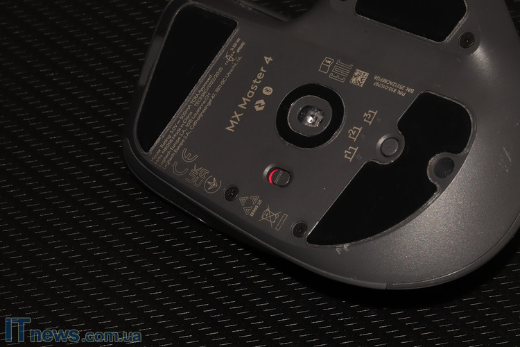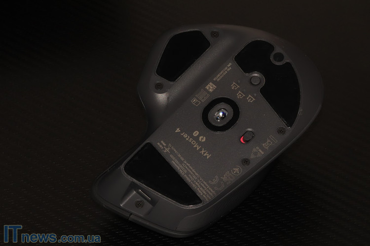 Нижня панель – це тефлонові ніжки по периметру для більш зручного та надійного ковзання, перемикач живлення, а також ще один, що дозволяє перемикатися – між трьома пристроями до яких мишка підключена в конкретний момент. За масив різноманітних технічних даних, звісно ж, також ніхто не забув.