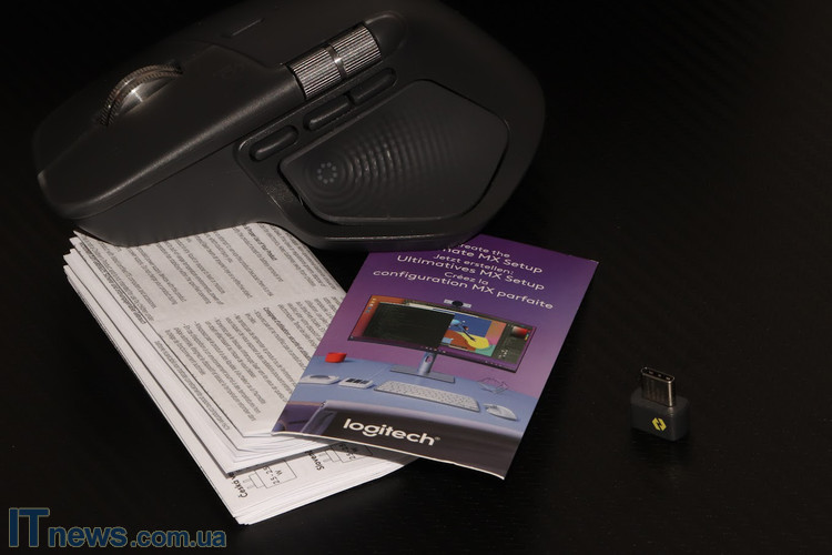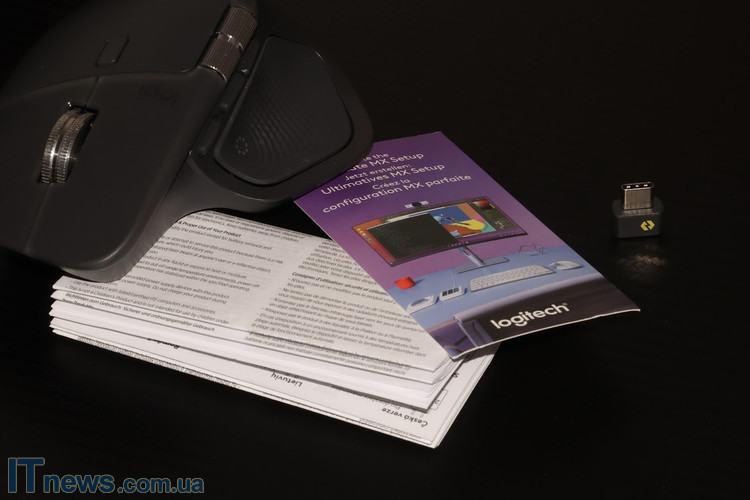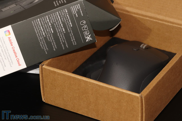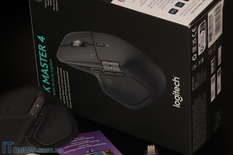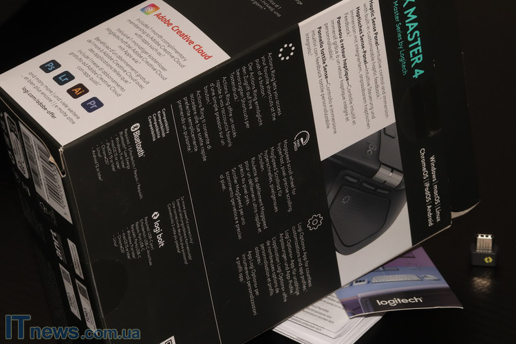 Одна з бічних стінок "підкаже" за бонус для покупця MX Master 4, а ще перелік того, що знаходиться в комплекті поставки моделі.