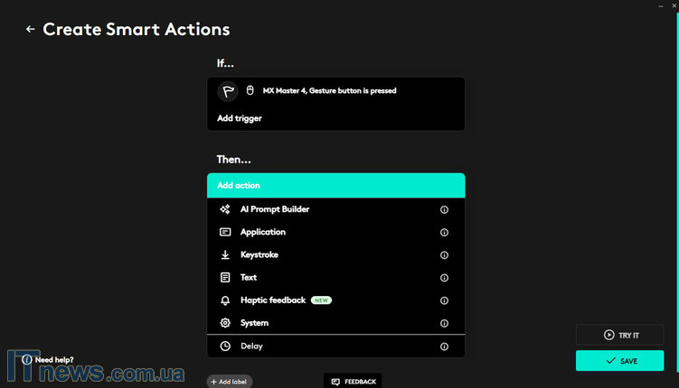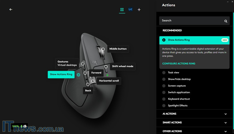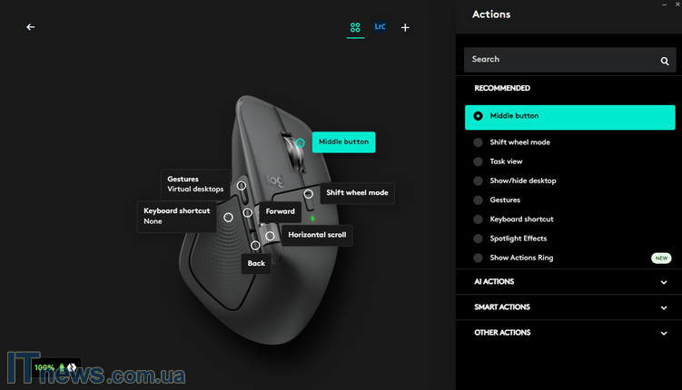 З цікавого, перш за все, маємо шорткати для мишок. Далі йдуть активні завдання чи переходи між вікнами, ще є можливість налаштувань кнопки на будь-яке поєднання клавіш, створити Smart Actions та AI Actions і ін.