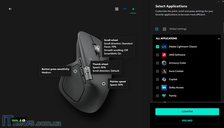 Logi Options+ "забезпечує" тонкі налаштування кожної кнопки даної мишки. "Арсенал" налаштувань мегавеликий, запам’ятати все майже неможливо, але зрозумівши логіку їх, зможете виконувати налаштування максимально грамотно під свої потреби. Саме розуміння логіки значно спрощує підбір налаштувань під конкретне завдання.