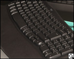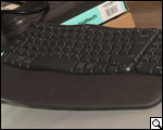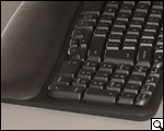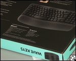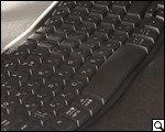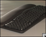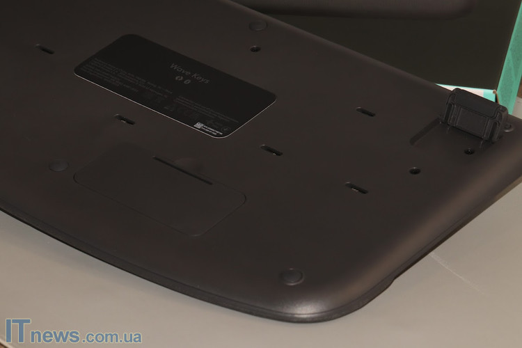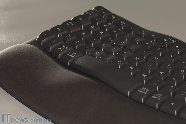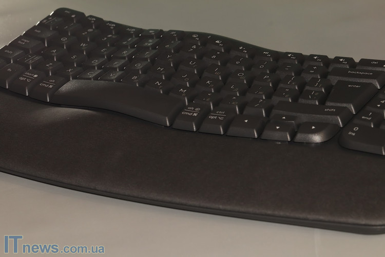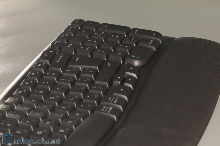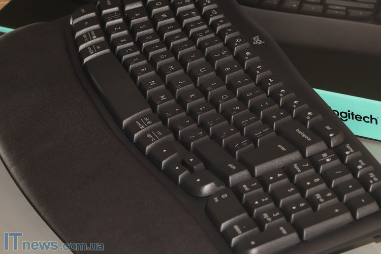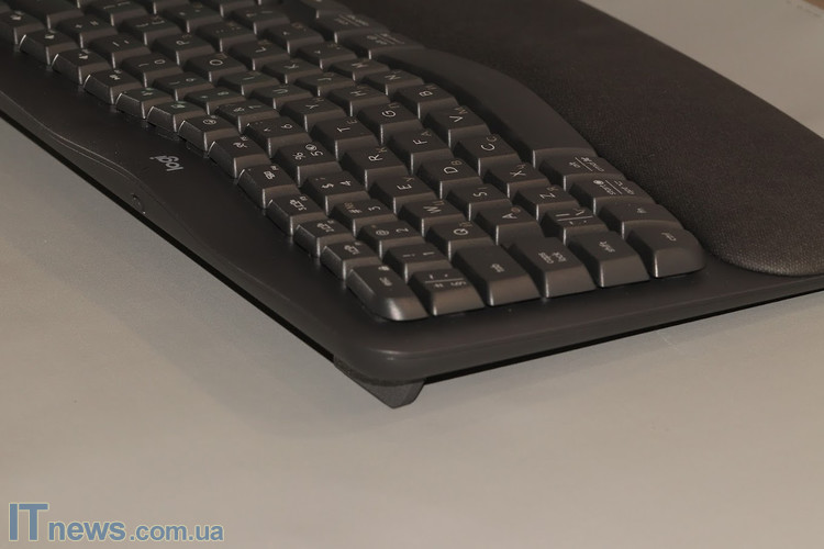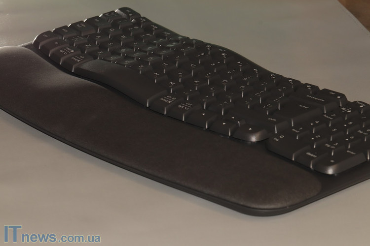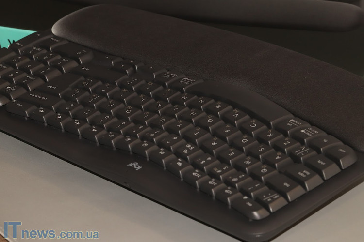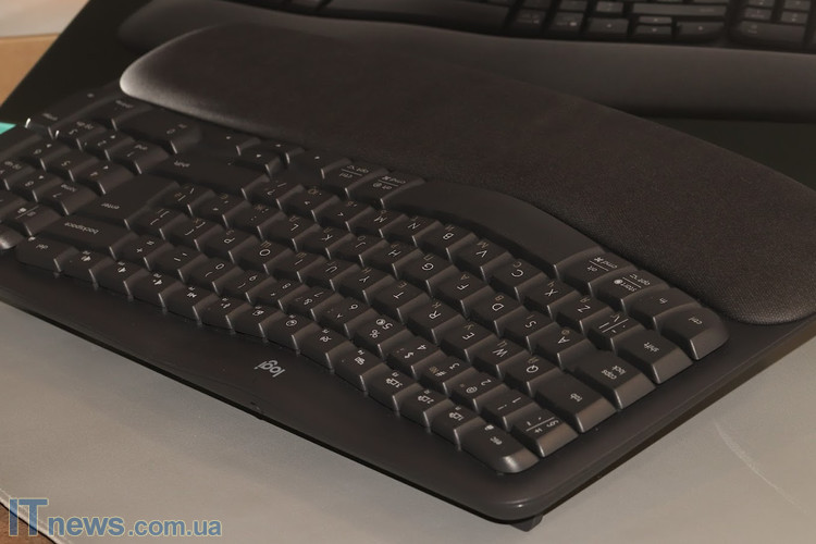 Одна з найбільш цікавих моделей бездротових клавіатур, що особисто мені доводилося бачити. Незвичайний формфактор що нагадує хвилю, а підставка під руки – це стійка до взаємодії з довкіллям тканина + пінонаповнювач з ефектом пам’яті.