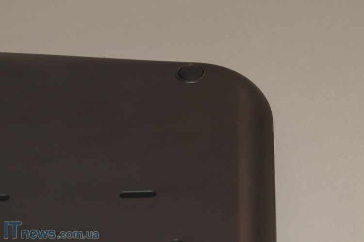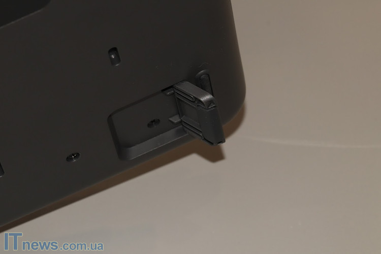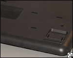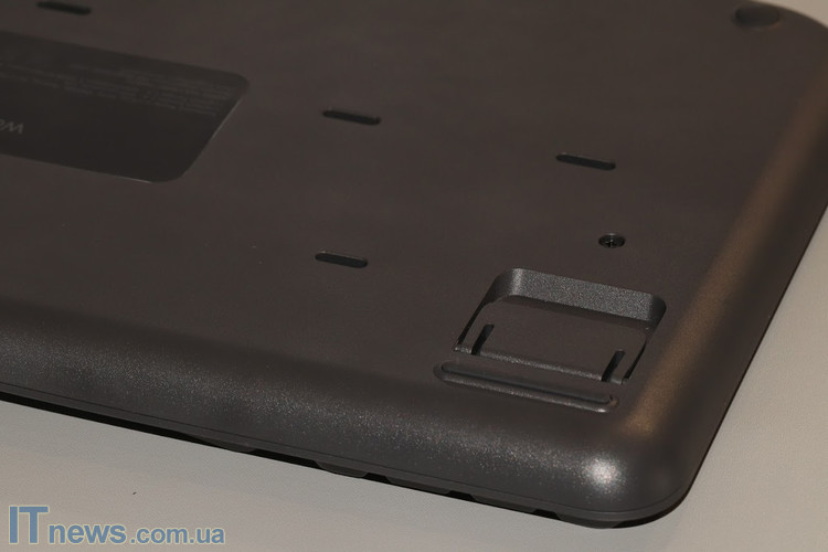 Нижня частина корпусу примітна гумовими ніжками по периметру, парою класичних відкидних підставок також з гумовими ребрами для більш стійкого зв’язку з поверхнею столу, на якому розміщена в конкретний момент. В центрі панелі помітна наліпка з різноманітною інформацією щодо моделі, посадкові місця під гвинти, а також акумуляторний відсік, в якому, як пам’ятаємо вже "з коробки" два елементи живлення формату ААА.