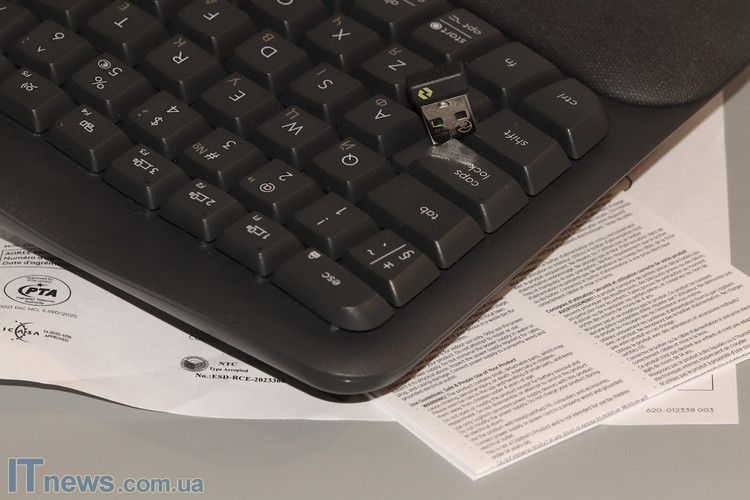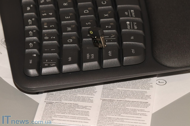 Комплект поставки клавіатури доповнено двома батарейками ААА ("з коробки" у відповідному відсіку), а також USB-приймачем Logi Bolt + необхідною документацією, включаючи змістовну вкладку щодо налаштувань.