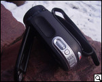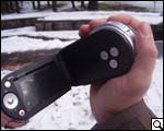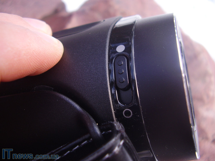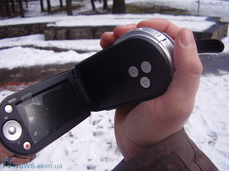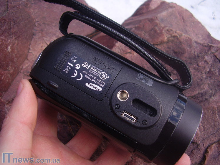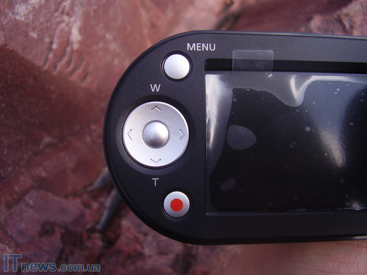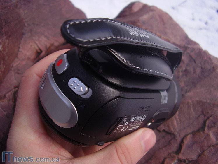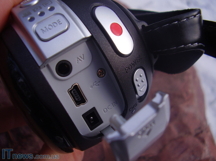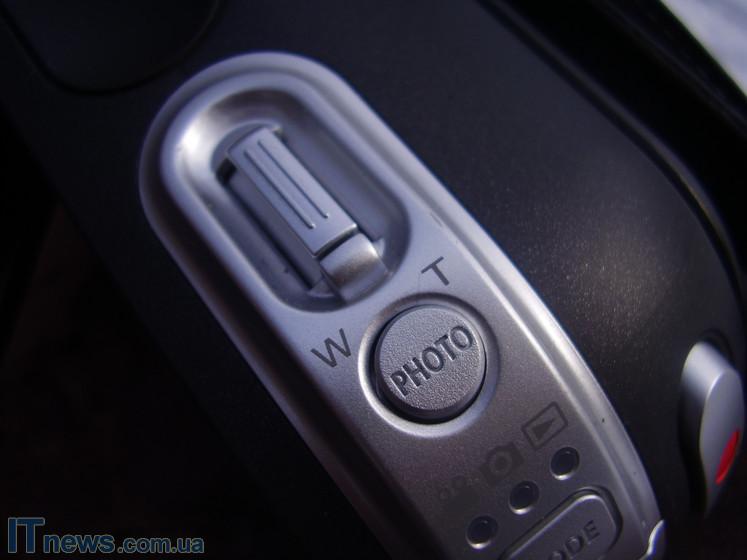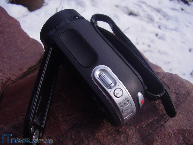 Далее, по верхней части камеры находится небольшая канавка, которая здесь реализована всего с одной целью – в эту канавку ложатся пальцы руки, для более комфортного удержания камеры. Радует также тот факт, что пальцами той же руки пользователь может управлять съемкой – регулировать зум, переключаться между функциями записи и фотосъемки, а также просматривать отснятый контент, и, само собой, разумеется, включать и выключать аппарат. Более детально на этих особенностях мы остановимся в следующем разделе.
