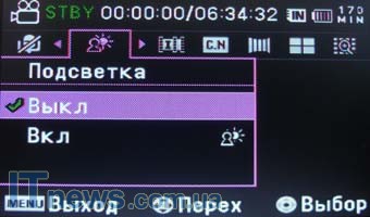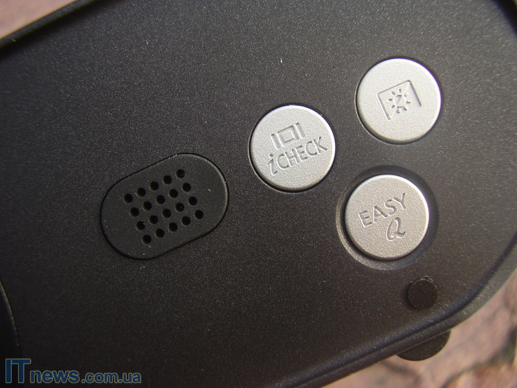 Справа от экрана расположено еще три кнопки, а также сеточка динамика. Первая кнопка, с надписью Check на ней позволяет отключать или наоборот активировать технические показатели экрана во время съемки, количество записанной информации, количество оставшегося времени или места и др. Режим EASY, за который отвечает другая кнопка – позволяет проводить съемку при автоматических настройках. И последняя функциональная клавиша с изображенной на ней лампочкой отвечает за регулировку баланса белого при съемке.