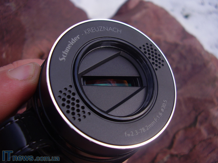 Традиционно, объектив камеры размещен на передней панели, здесь же находится надпись фирмы-разработчика оптики, некоторая техническая информация об объективе, а также две сеточки микрофонов.