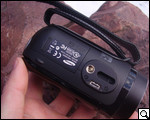 Подставка здесь реализована следующим образом: одно отверстие непосредственно устроено для того, чтобы удерживать в необходимом положении камеру, а второе - для прямой синхронизации с ней. К слову говоря, необходимость в такой подставке косвенная. Дело в том, что на одном из выходов этой подставки размещены три разъема под функциональные шнуры. Справа налево идут разъемы аудио-видео, mini-USB, а также для зарядного устройства. Все эти шнуры можно подсоединить в камере одновременно. Но дело все в том, что сделать это можно как через описываемую подставку, так и напрямую синхронизировать с камерой, открыв при этом заслонку с надписью "Open". Единственный момент при всем этом – на подставке камера будет намного устойчивее, чем без нее. На правой боковой грани, если рассматривать объективом от себя, расположен специальный ремень-крепление. Этот ремень является своего рода страховкой, в случае возможного выскальзывания аппарата с руки. На левом боковом торце расположена многофункциональная крышка. Внешняя сторона крышки – это только декор – здесь реализован глянцевый пластик с множеством наклеек на поверхности.