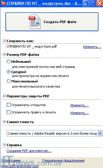 Вначале посмотрим на основные моменты первой программы. Диалоговое окно дает возможность пользователю сразу же выбрать необходимый файл, после чего установить соответствующие настройки, а именно оптимальный размер файла, присвоить имя файлу, установить (или не устанавливать, здесь сугубо по желанию) пароль на открытие файла, а также защиту на основные моменты, связанные с его редактированием. После чего, нажатием кнопки "Создать PDF-файл" (кнопка большая, расположена на самом верху диалогового окна), начинаем процесс конвертации. К слову говоря, процесс этот недлительный, и даже на большой файл не уйдет более 5 минут. Интересным моментом можно здесь назвать также тот, что помимо конвертации всего файла, доступна также конвертация отдельных страниц.
