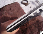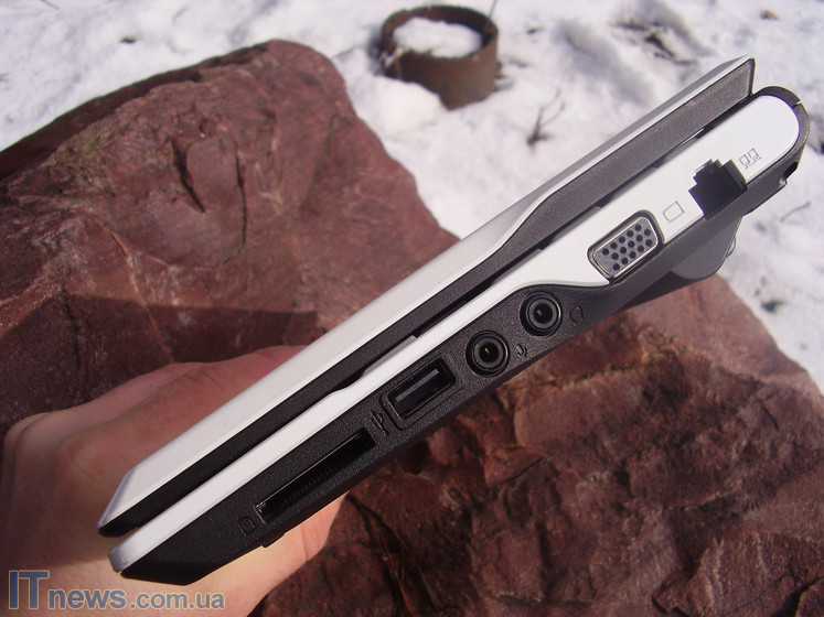 Осмотрев правую грань, мы обнаружили сетевой и VGA-разъем, два разъема под наушники и микрофон, соответственно, а также USB-интерфейс и небольшой кардридер.