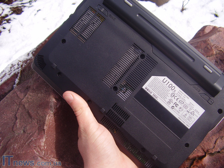 И в нескольких словах о нижней платформе. Здесь, кроме сеточек системы охлаждения процессора, находится также наклейка с технической информацией о модели, а, кроме того, защелки системы крепления батареи. Реализация этих элементов удовлетворительная.