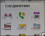 Подпунктов меню всего 12: "игры и приложения", "вызовы", "органайзер", "мультимедиа", "сообщения", "мои папки", "профили", "контакты", "инструменты", "браузер", "соединения" и "настройки".