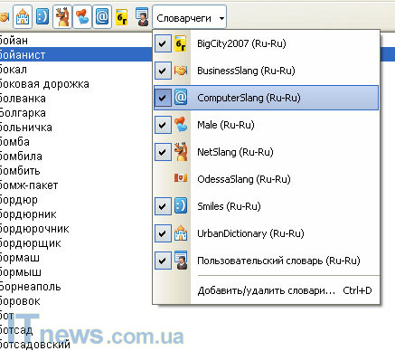 Что еще хорошего удалось узнать из упаковки, так это то, что программный комплекс содержит целый ряд интересных, а главное полезных словарей: "словарь компьютерного сленга", "словарь сетевой лексики", "женско-мужской словарь", "словарь сокращений IM", "иллюстрированный словарь американского сленга" и достаточно большое количество других словарей. Желающие могут ознакомиться с полным перечнем ниже, рассмотрев следующий снимок.