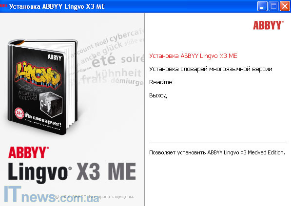 Сразу же после запуска диска в дисководе на экране появляется диалоговое окно, с четырьмя подпунктами меню, под которым проведена горизонтальная черта. Под этой чертой, в свою очередь, представлена расшифровка каждого из подпунктов. Итак, есть подпункты "Установка ABBYY Lingvo x3 Medved Edition", "Установка словарей многоязычной версии", "Readmе" и "Выход". Если два последних, а также первый, подпункты объяснений не требуют, то второй отвечает за установку многоязычной версии словаря ABBYY Lingvo x3 в испытательном режиме. Компания предлагает на протяжении 30 дней работать с этим словарем, после чего или приобрести лицензию, или же попросту удалить компоненты программ с компьютера.