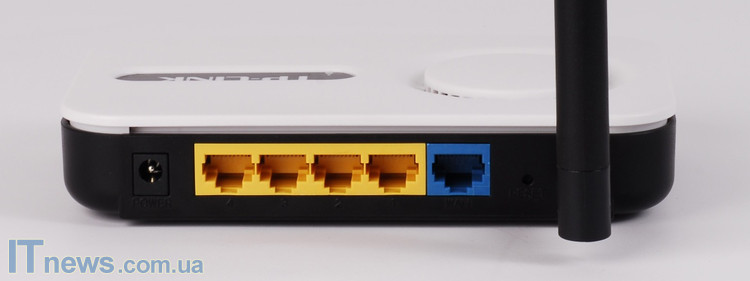 На задней боковой грани сосредоточены основные функциональные элементы устройства. Здесь находятся: разъем для кабеля питания, четыре сетевых разъема LAN, а также разъем WAN (порт для подключения канала Интернет). Далее следует кнопка reset (перезагрузка) и коннектор для подключения антенны.