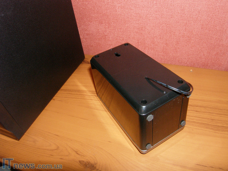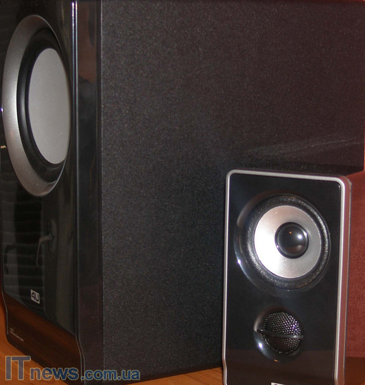 Перейдем теперь к сабвуферу. Здесь все несколько иначе. Черный пластиковый глянец, подобный тому, что используется в корпусе колонок, присутствует и здесь, но только на передней панели. Кстати, снова ощущается своеобразная дань дизайну, неправда ли!?