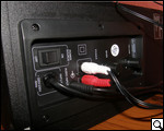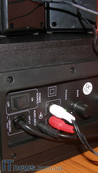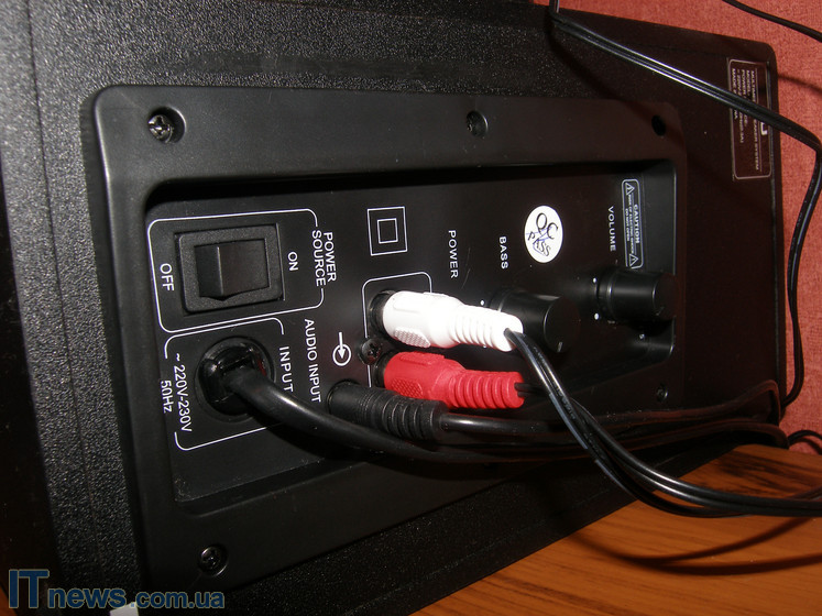 Весь возможный механизм управления А520 размещен на сабвуфере и сосредоточен на тыльной стороне. Осмотрев ее, удалось обнаружить два рычага регулировки громкости на колонках и басов на сабвуфере, клавишу-качельку переключения питания системы, два разъема для подключения колонок, разъем для подключения проводного регулятора громкости, а также несколько наклеек, с вынесенной на них технической информацией о новинке.