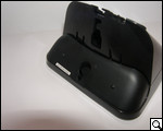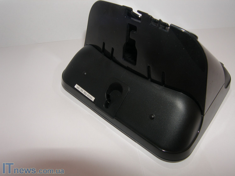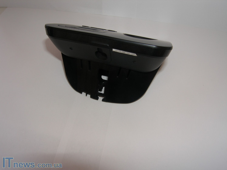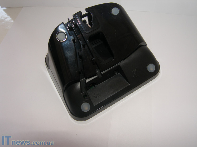 Осмотрим тыльную сторону и нижнюю платформу главного аппарата. Нижняя платформа представлена из двух типов пластика – матового и глянцевого. Глянцевая часть содержит на себе всевозможные прорези и канавки. Предназначение их обычное – по этим канавкам пользователь пропускает шнуры кабеля зарядки и непосредственно телефонный. Канавки как бы вбирают шнуры в тело корпуса, таким образом, главный корпус более устойчиво держится на площадке.