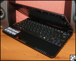 Заслуживает внимания и крышка аппарата. Прежде всего, впечатляет ее толщина. Здесь она хотя и вдвое тоньше самого корпуса нетбука, тем не менее, сама по себе достаточно массивная. Впрочем, общей картины визуального восприятия модели такое решение ничуть не портит.