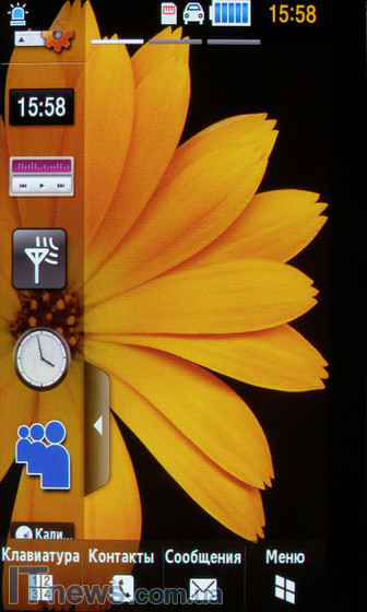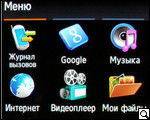 Само же меню реализовано, как и экран, - в трех форматах. Первый формат – традиционен, со всеми стандартными приложениями: здесь есть журнал вызовов, google, музыка, Интернет, видеоплеер, "мои файлы", календарь, камера, фотогалерея, фото контакты, будильник, настройки.