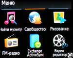 Во втором формате меню сосредоточены следующие приложения: "найти музыку", "сообщество", "рисование", fm-радио, Exchange Active Syns, видеоредактор, игры и приложения, диктофон, Bluetooth, синхронизация, таймер и секундомер.