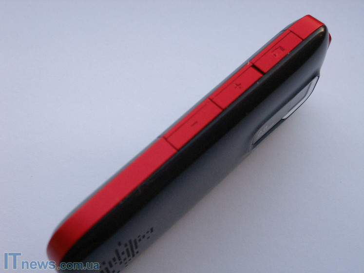 На правой боковой грани расположена спаренная кнопка-регулировщик звука, а также слот для расширения встроенной памяти телефона. К слову говоря, встроенной памяти в терминале всего 30 МБ, так что закоренелому меломану без ее расширения никак не обойтись. Радует тот факт, что, несмотря на то, что мы имеем дело с бюджетным терминалом, здесь, тем не менее, поддерживаются карты памяти максимальным объемом 4 ГБ.
