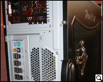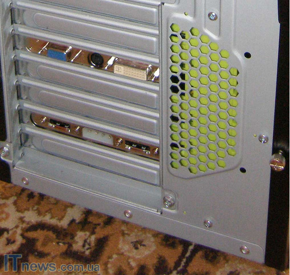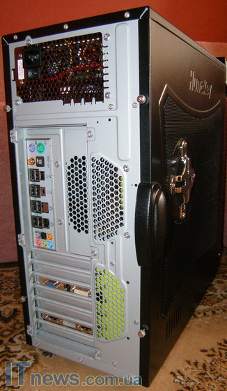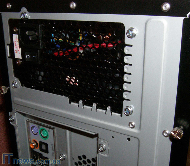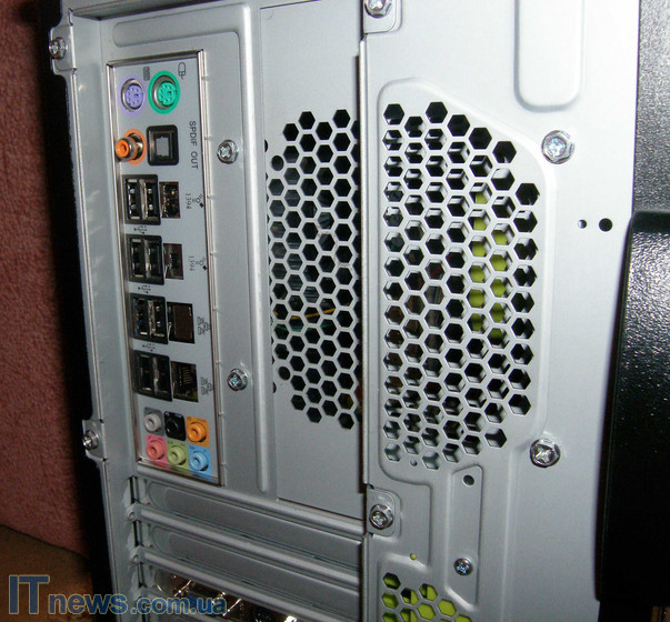 Реализация тыльной панели мало, чем отличается от большого количества собратьев, существующих сегодня на рынке. В самом верху панели виднеется темная сеточка блока питания. Сеточка, разумеется, необходима только с одной целью – обеспечить хорошую циркуляцию воздуха и охлаждения работы системы.