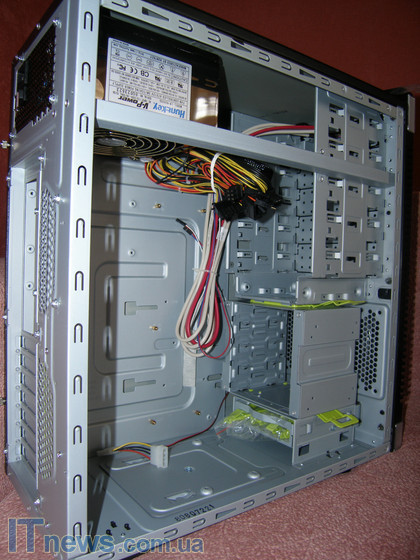 Что же касается осмотра внутренней части корпуса, здесь мы отметили две вещи – блок питания мощностью 500 Вт, который вне сомнения обеспечит электричеством любые комплектующие, а также мощную каркасную систему, на которую крепятся все элементы.