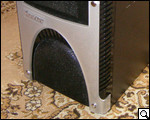 Левая же боковая панель имеет большую вставку из стальной сеточки, а также стальную насадку, которая крепится на корпус при помощи четырех винтов. Насадка отвечает за удержание специальной колбы внутри корпуса, при помощи которой происходит обдувание системы.