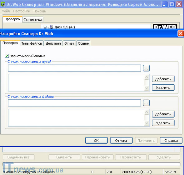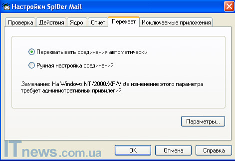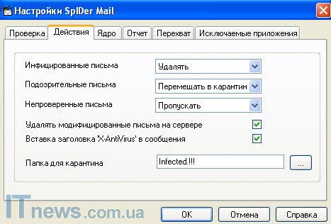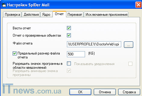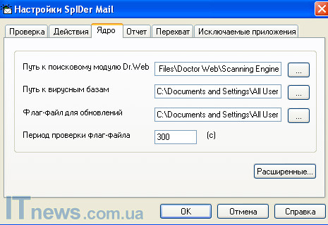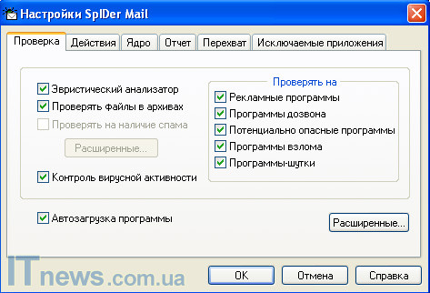 Два первых раздела "Проверка" и "Действия" предельно понятны. Первый дает возможность отрегулировать настройки проверки, а также настроить процедуру, при помощи которой программа будет действовать в случае обнаружения того или другого вида вредоносного ПО. Два следующих подраздела "Ядро" и "Отчет" - это больше технические разделы, не имеющие большое значение для пользователя. "Перехват" и "Исключаемые приложения" также не сложны в освоении. Первый дает возможность автоматического или ручного перехвата соединений, посредством которых вредоносная программа попадает на компьютер пользователя, а вторая - добавить в память программы приложения, которые впоследствии не будут восприниматься как вредные для ОС.