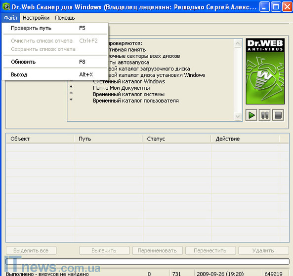 В командной строке программы присутствует три раздела: "Файл", "Настройки" и "Помощь". Последний из подпунктов, на наш взгляд, не несет особого интереса. Что же касается подпункта "Файл", здесь главными особенностями являются возможность проверить заданную директорию, очистить или сохранить список отчета, обновить программу, а одним из методов - завершить работу с активным окном антивируса.