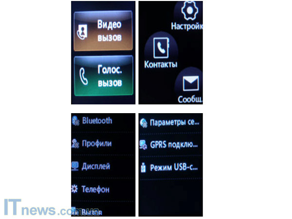 Первый подпункт меню дает пользователю возможность выбора типа вызова (голосовой вызов либо же видео). Далее, также перелистывая, справа налево либо наоборот, пользователь попадает в основное меню, состоящее из четырех иконок – "Сообщения", "Контакты", "Настройки" и "Инструменты".