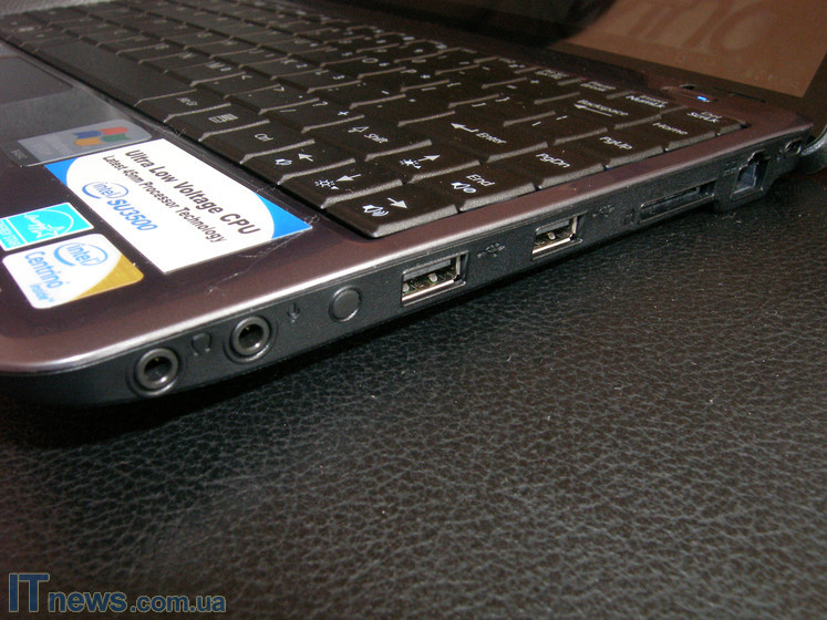 На правой боковой грани расположены разъем для крепления противоугонного троса, сетевой разъем, небольшой кардридер, а также два интерфейса USB, кнопка с непонятным предназначением и разъемы под кабель наушников и микрофона.