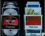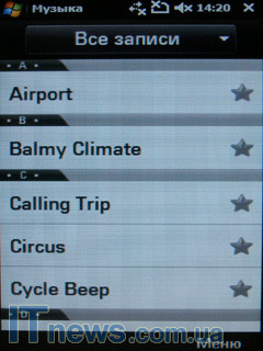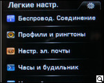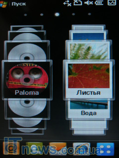 При нажатии на эту кнопку пользователь попадает уже в знакомую схему раздела, реализованную в форме 4-х строчек-разделов: "связь", "мультимедиа", "программы", "настройки". В каждом подразделе около десяти иконок, а поскольку на главной страничке их доступно только 4, к остальным можно добраться, лишь перелистывая строку. Кстати, датчика движения здесь мы не обнаружили, поскольку при перевертывании смартфона горизонтально расположение иконок не изменилось!