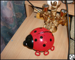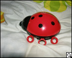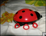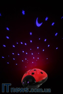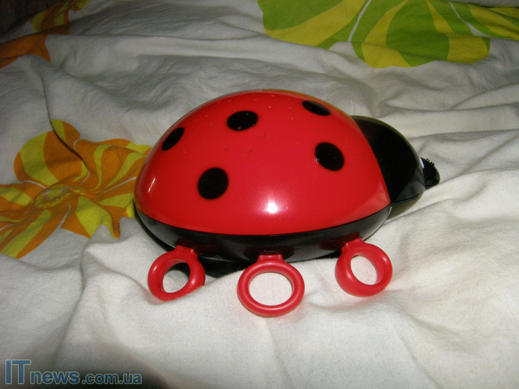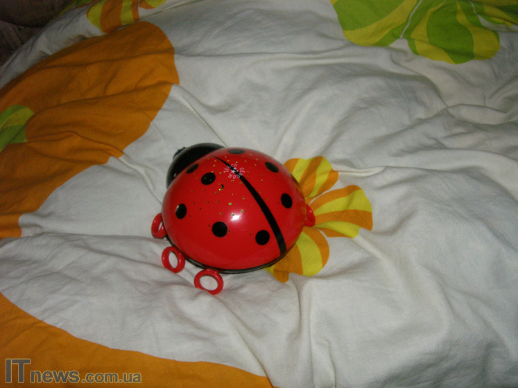 Как мы уже отмечали, светильник изготовлен в виде детской игрушки – больших размеров "Божьей коровки". Корпус выполнен из пластиковых деталей нескольких цветов. Вся верхняя часть "коровки" – красный глянцевый пластик. Если внимательно присмотреться к панели, можно увидеть множество прорезей в виде звездочек и полукруглых месяцев. Именно через них и рассеивается луч света.