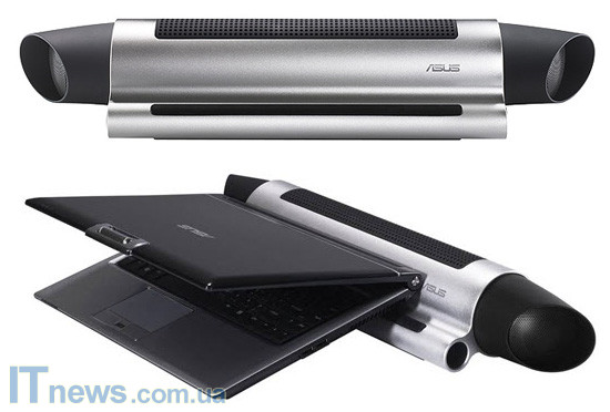 Итак, Asus uBoom. Модель привлекает главным образом двумя особенностями – отличным качество звучания, а также особенностями подставки для ноутбука. Как одно из преимуществ, на специальную подставку, реализованную монолитно относительно корпуса акустической системы, пользователь может ставить ноутбук во время работы. Клавиатура ноутбука приобретает примерно 30-градусный наклон, и таким образом, становится более удобна для набора массивов текста.