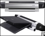 На пластик "одета" очень прочная алюминиевая колба. Форма колбы достаточно необычная. Помимо того, что колба как бы служит защитным панцирем пластиковому корпусу, к ней же монолитно приделана упомянутая подставка для ноутбука. Подставка реализована в форме трубки из того же типа материала.