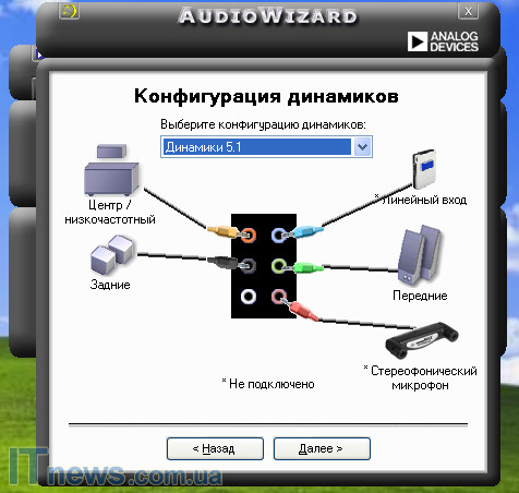 Если же в результате всех "манипуляций" хорошего звучания системы вы так и не добились, советуем открыть снова SoundMAX, найти на верхней панели иконку меню в виде звездочек. Этот подпункт меню подскажет, как правильно подключить систему к компьютеру. Иллюстративно вся процедура состоит в следующем: