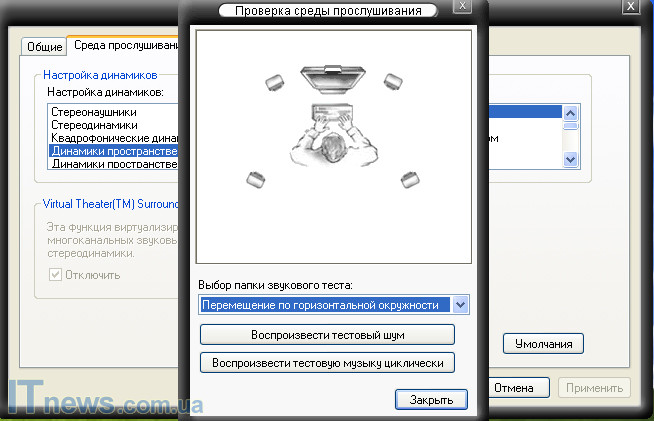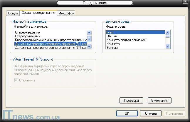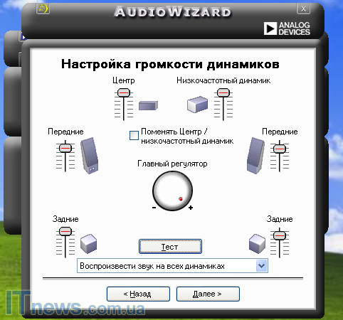 Итак, мы подключили все колонки к сабвуферу. Провели также подключение к ПК, но все равно в системе не все динамики "играют". В чем же дело? Оказывается, в подменю "Предпочтения системы" утилиты SoundMAX, у пользователя вместо ярлыка "Динамики пространственного звучания 5.1" выставлено "Стереодинамики" или "Стереонаушники". Таким образом, вместо трех каналов работает всего один. Поэтому, прежде всего, следует переключить ярлык на отметку "Динамики пространственного звучания 5.1". Далее в этом же диалоговом окне произвести проверку, нажав на окошко "Проверка". Затем выбрать режим проверки и нажать соответствующую кнопку. Если с отображением звука в компьютере пользователя все в порядке, ожидаемый звук будет исходить со всех динамиков и сабвуфера. После завершения этой процедуры советуем перезагрузить компьютер. После перезагрузки зайти еще раз в SoundMAX, выбрать тот же подпункт и поставить на подпункте "Звуковые среды" галочку на ярлыке "нет" - это оптимальный вариант выбора окружающей среды, в которой находится акустическая система.