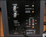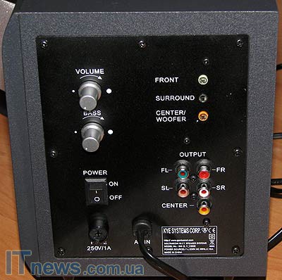 Кроме упомянутых разъемов на этой же панели расположены ручки регулирования звука на колонках и басов на сабвуфере. Далее виднеется клавиша-качелька переключения питания устройства, а также регулятор FUSE 250V/1A. Кроме того, здесь же расположена небольшая информационная наклейка о маркировке продукта и мн. др.